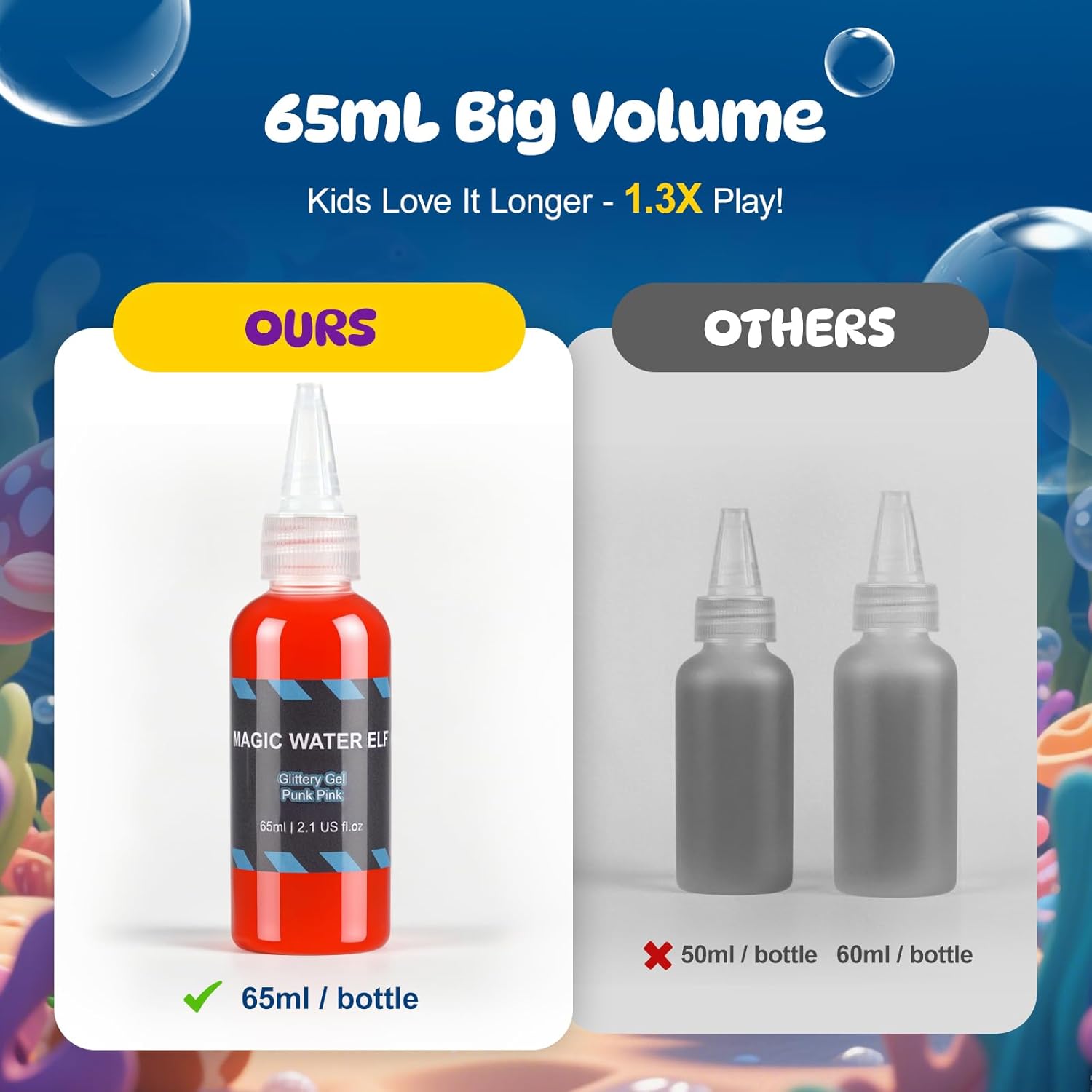- The magic water elf toy kit includes 20 x 65ml gels (10 solid + 10 glitter), 10 marine molds, and 4 packs of magic powder. It also comes with complete tools: 2 nets, 2 stir sticks, 2 gloves, measuring stickers, and a storage box. Kids mix the gels and powder to create aquatic pets using molds like sharks and seahorses.