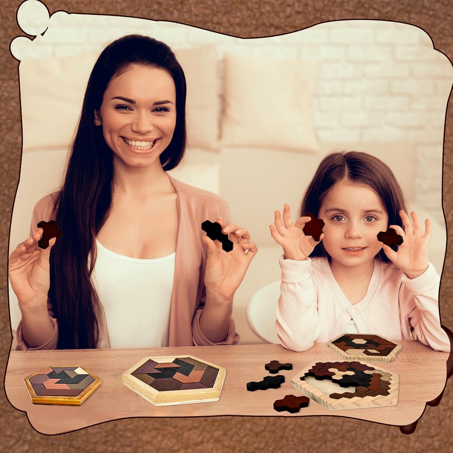 6 Pack Wooden Hexagon Tangram Puzzle Wood Tangram Block Puzzle Set with Storage Bag for Challenge Intelligence Teasers Logic Mind Game