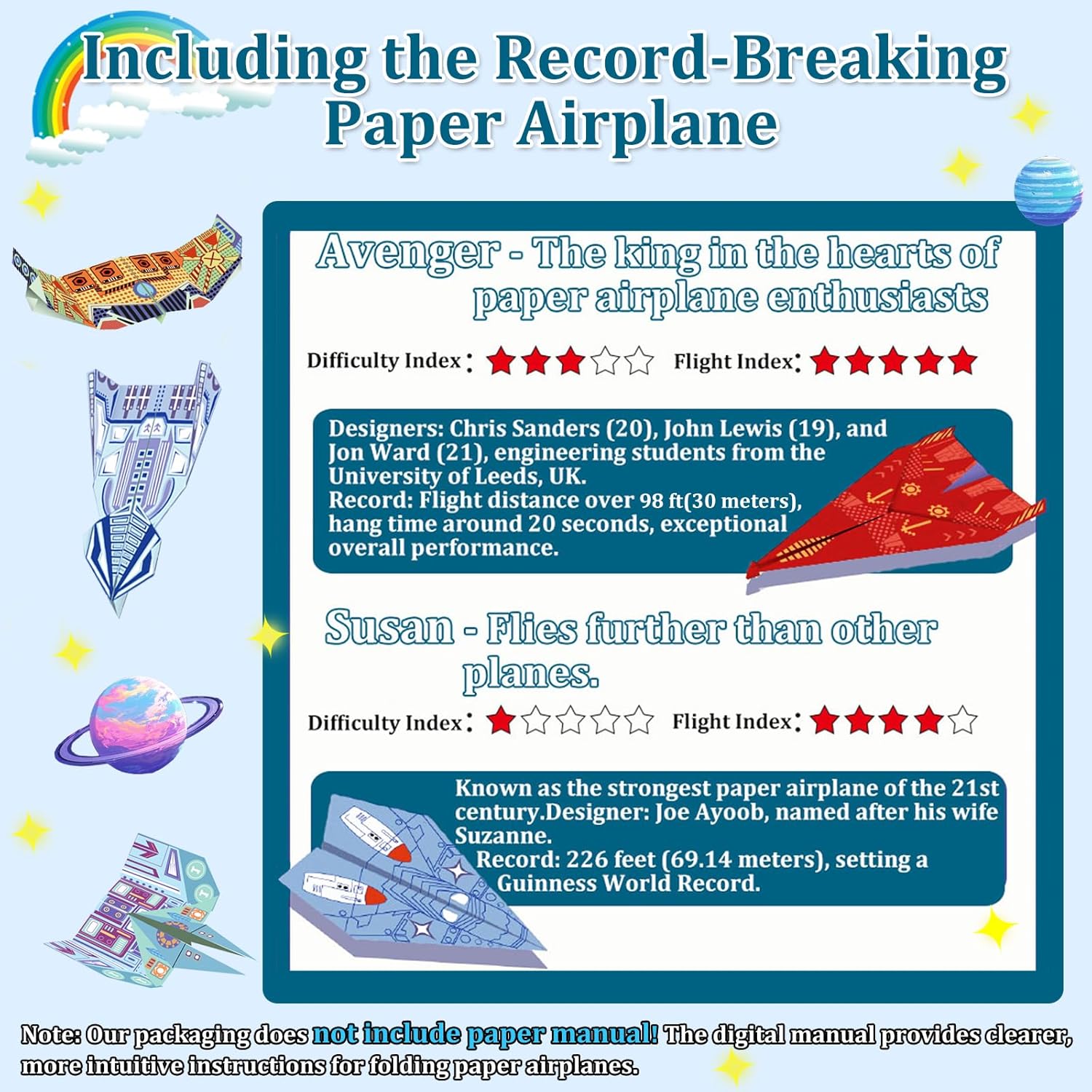 Paper Airplane Kits with 16 Classic Designs, 32 Sheets of Colorful Origami Paper, World Record Paper Planes, Airplane Gifts for Boys and Girls Ages 6-12+ (Digital Manual Only, Fun and Easy to Fold)