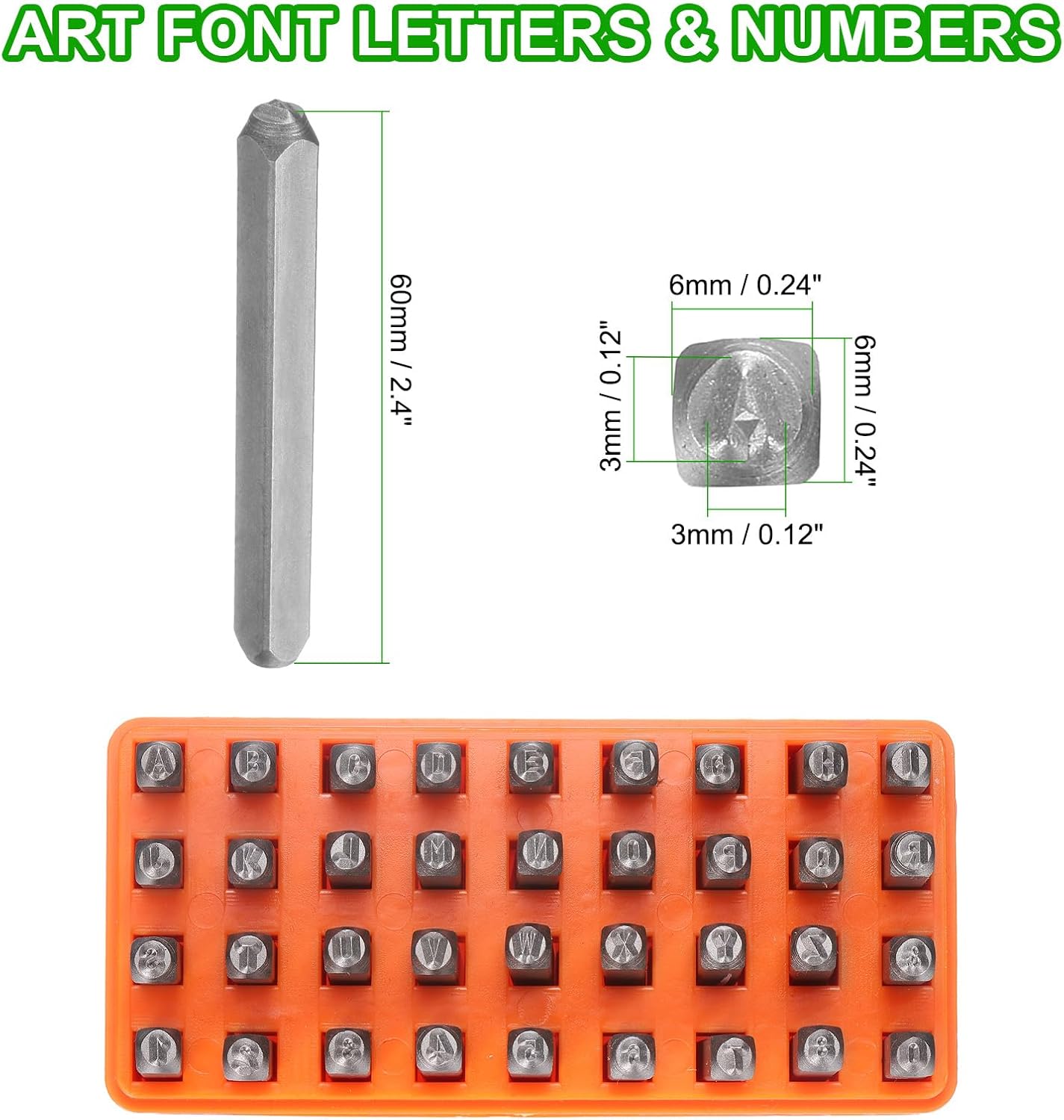 - Size - Letters: 3x3mm / 0.12x0.12 inch (LxW); Steel bars: 60x6x6mmmm / 2.4x0.24x0.24 inch (LxWxH); Package includes: 36 x metal punch stamps (26 uppercase letters from A to Z, numbers from 0 to 8, an '&' symbol, the "6" stamp can be used as a "9")