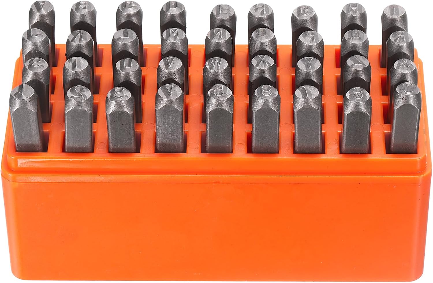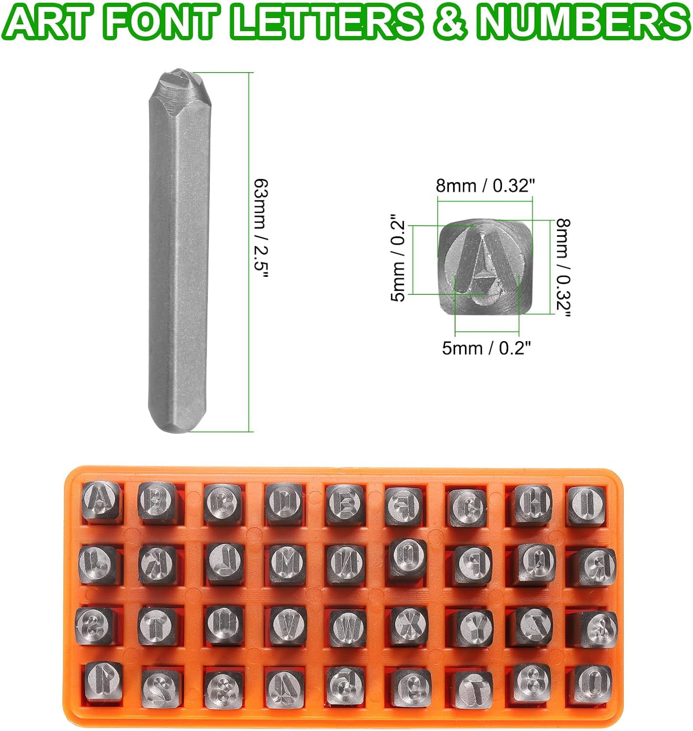 - Size - Letters: 5x5mm / 0.2x0.2 inch (LxW); Steel bars: 63x8x8mmmm / 2.5x0.32x0.32 inch (LxWxH); Package includes: 36 x metal punch stamps (26 uppercase letters from A to Z, numbers from 0 to 8, an '&' symbol, the "6" stamp can be used as a "9")