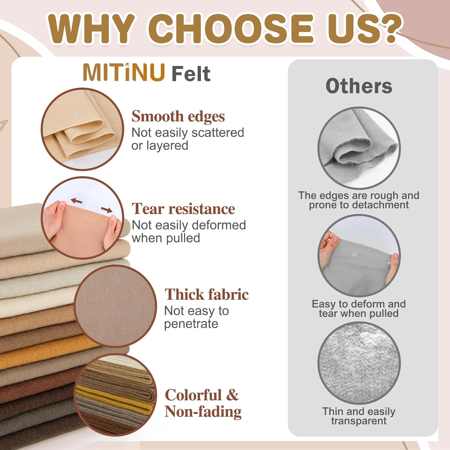 - 【Brown Tone Series Felt Fabric】:Our felt fabric portfolio contains 12 Brown Tone series colors, the size of each roll is 8 "x35"(20.5x90cm) and the thickness of the felt is about 1.4mm. These craft felt are Thick and light tight, it can withstand prolonged use without wear or tear.