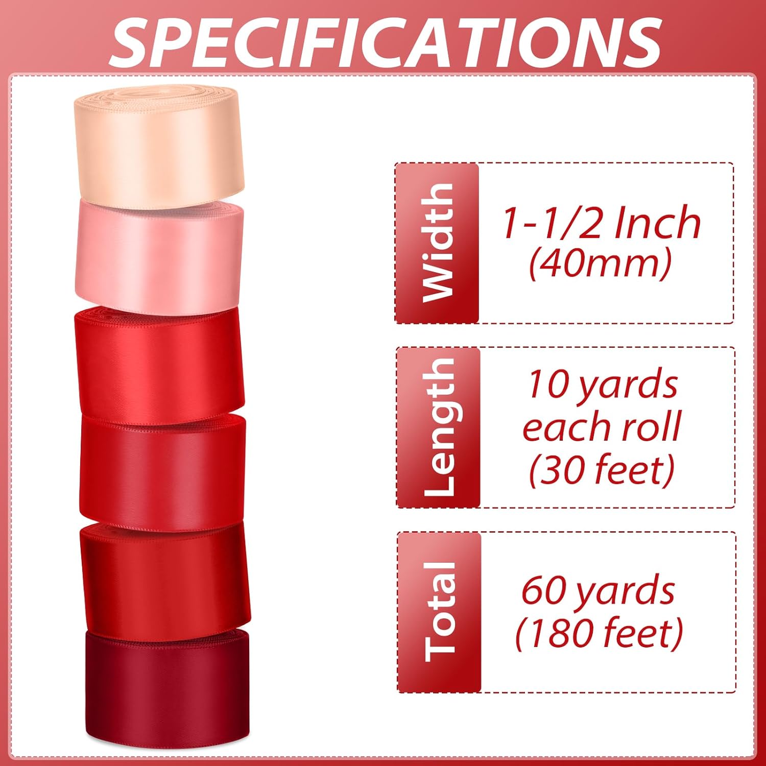 - 【What's Include】:6 rolls 1-1/2 inch wide single-faced red ribbon measures 10 yards (30 feet) each roll, 60 yards (180 feet) in total