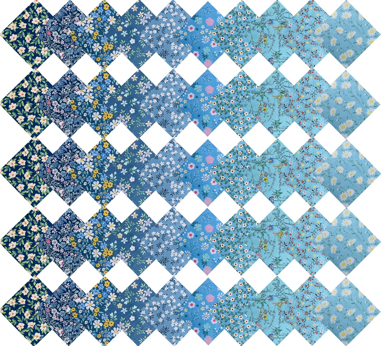 - Material and Size: These quilting fabric are made of 100% high-quality cotton, featuring soft and strong fabric bundles. Each sheet measures 5 x 5 inches. This set includes 50 pieces of blue printed fabric squares, providing a variety of colors to satisfy your multiple craft sewing needs.