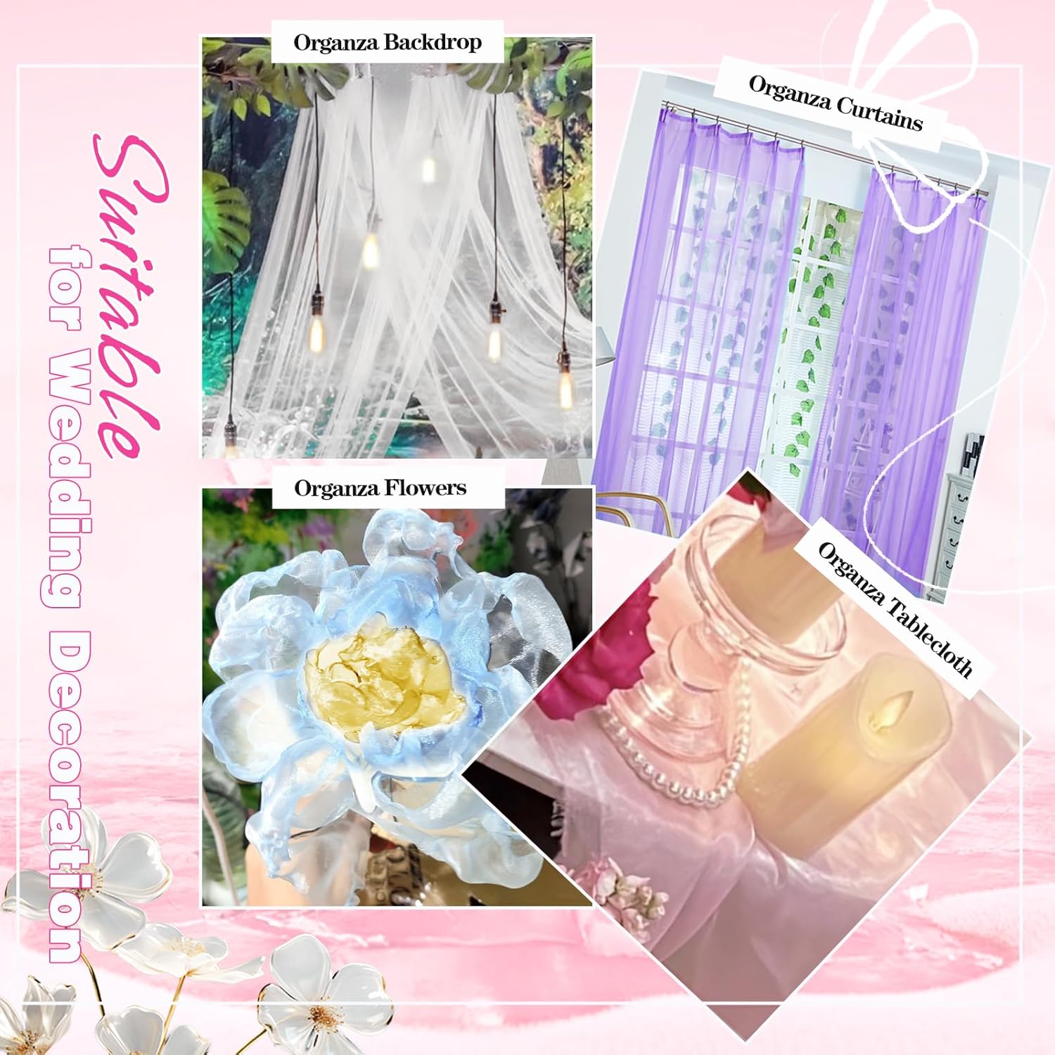 - What Will You Receive: 2 yards organza fabric (Pre-cut), Size: 72 x 60 Inch (L*W). Available Color: Gold, White, Royal Blue, Rose Gold, Black, Red, Hot Pink, Light Pink, Light Purple, Light Blue. You can give full play to your handicraft ability and creativity
