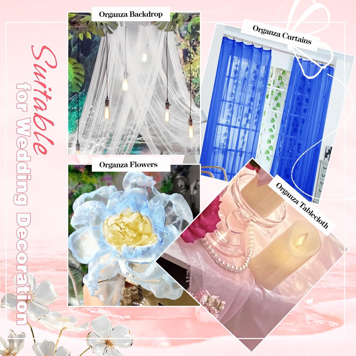 - What Will You Receive: 10 yards organza fabric (Pre-cut), Size: 360 x 60 Inch (L*W). Available Color: Gold, White, Royal Blue, Rose Gold, Black, Red, Hot Pink, Light Pink, Light Purple, Light Blue. You can give full play to your handicraft ability and creativity