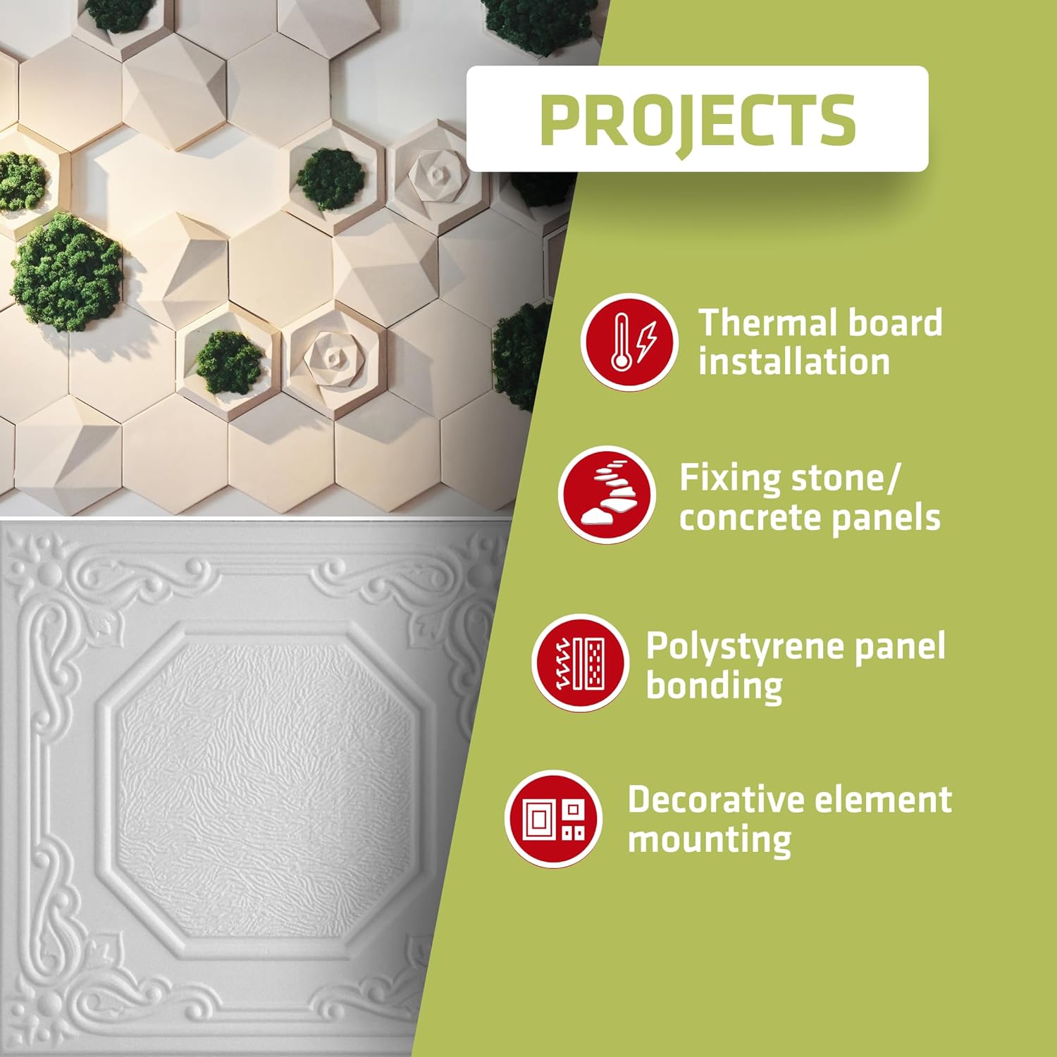 - VERSATILE USE FOR MULTIPLE APPLICATIONS – Ideal for XPS, EPS foam board insulation, lightweight concrete, decorative wall panels, construction foam projects, and facade claddings. Works as a heavy-duty construction adhesive, ensuring long-lasting, strong bonding on various surfaces.