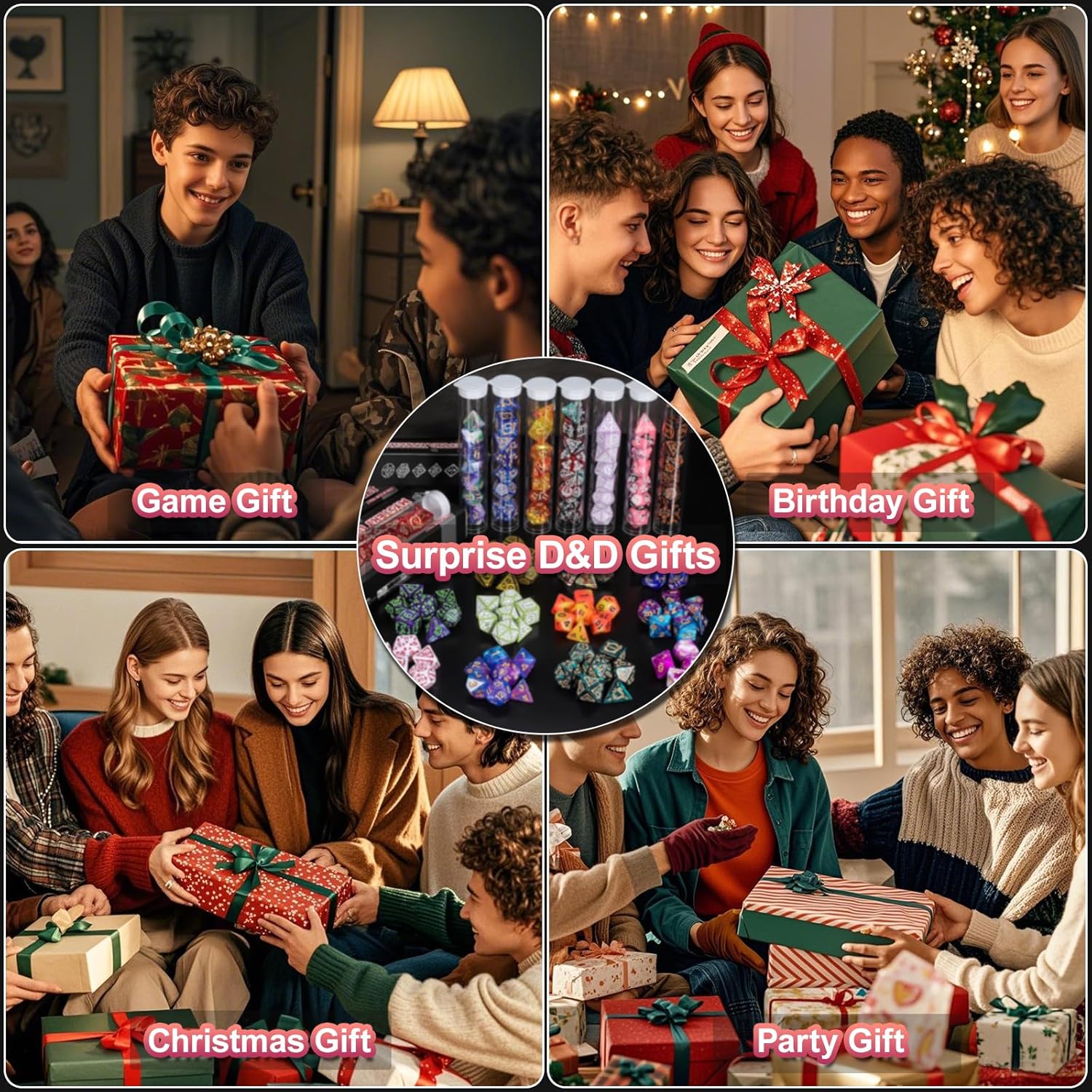 - Polyhedral Dice Set: You will get 1 DND Dice Gift Box. Each mystery dice box contains a full matching set of polyhedral dice; D4, D6, D8, D10, D%, D12, D20 plus 1 dice display tubes. (A complete set of polyhedral dice of the same style, not each dice has a different pattern!)
