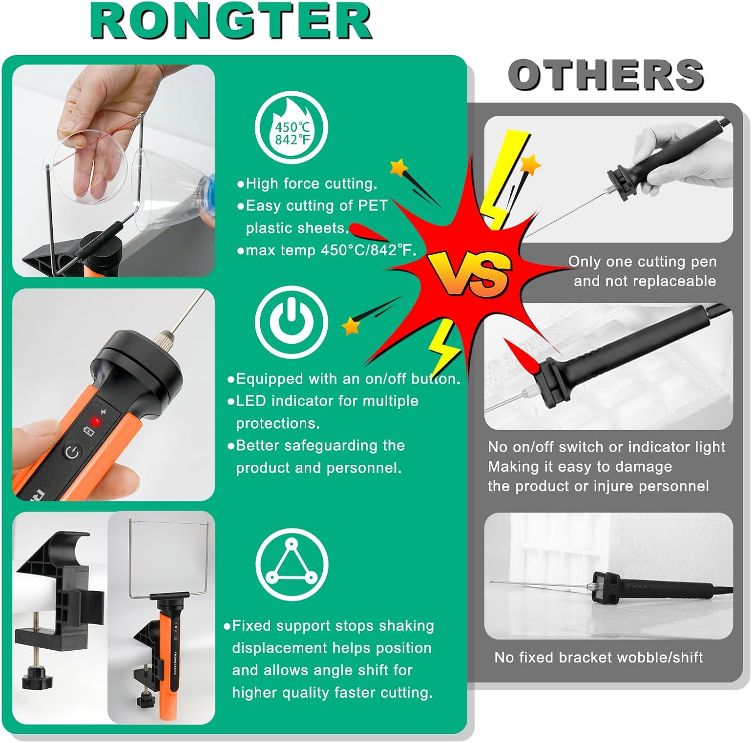 - 【Easy to Use】Rongter 4 in 1 electric styrofoam cutting tool comes with a metal support frame for resting the heated tip, so you don't worry about where to rest it when you want a break from your work. After it cools down, please wipe the heating needle with copper brush to avoid blackening and hardening caused