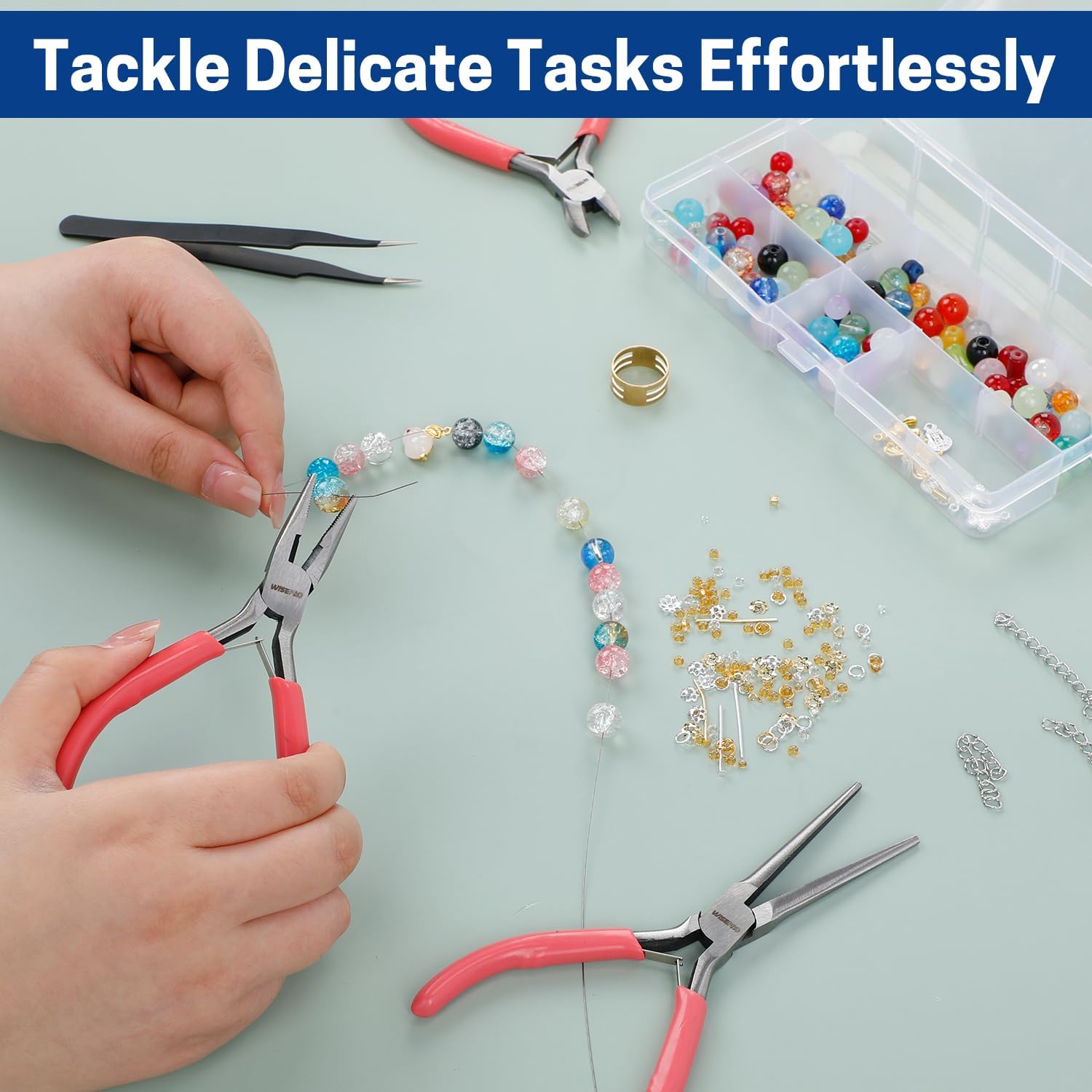 - 3PCS Mini Pliers Set: Includes needle nose pliers, long nose pliers, diagonal pliers, jump ring and tweezer. Available in two color options—orange & blue or pink & yellow. A thoughtful and practical gift for women, DIY lovers, jewelry crafters, model hobbyists, and home repair users.