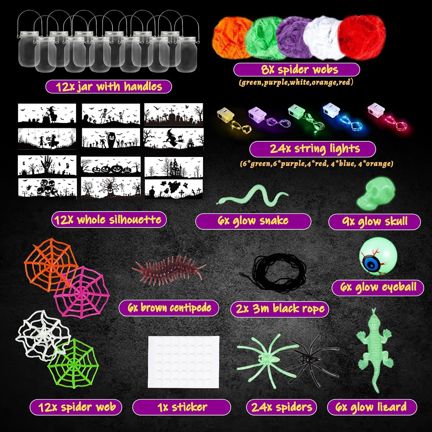 - Halloween Craft Kits: The Halloween DIY craft kit is full of surprises and fun, which contains 12 glass mason jars,24 string lights(green,purple,red, blue, orange),24 whole silhouettes(pumpkin, witch, skeletons, castle, ghost hand, sacred tree, graveyard, ghost etc.) and other crafting supplies necessary.In addition, some accessories toys including grow in the dark eyeballs, bugs, spiders, add more fun for your art decor. Perfect for transforming ordinary jars into eerie, glowing lanterns!