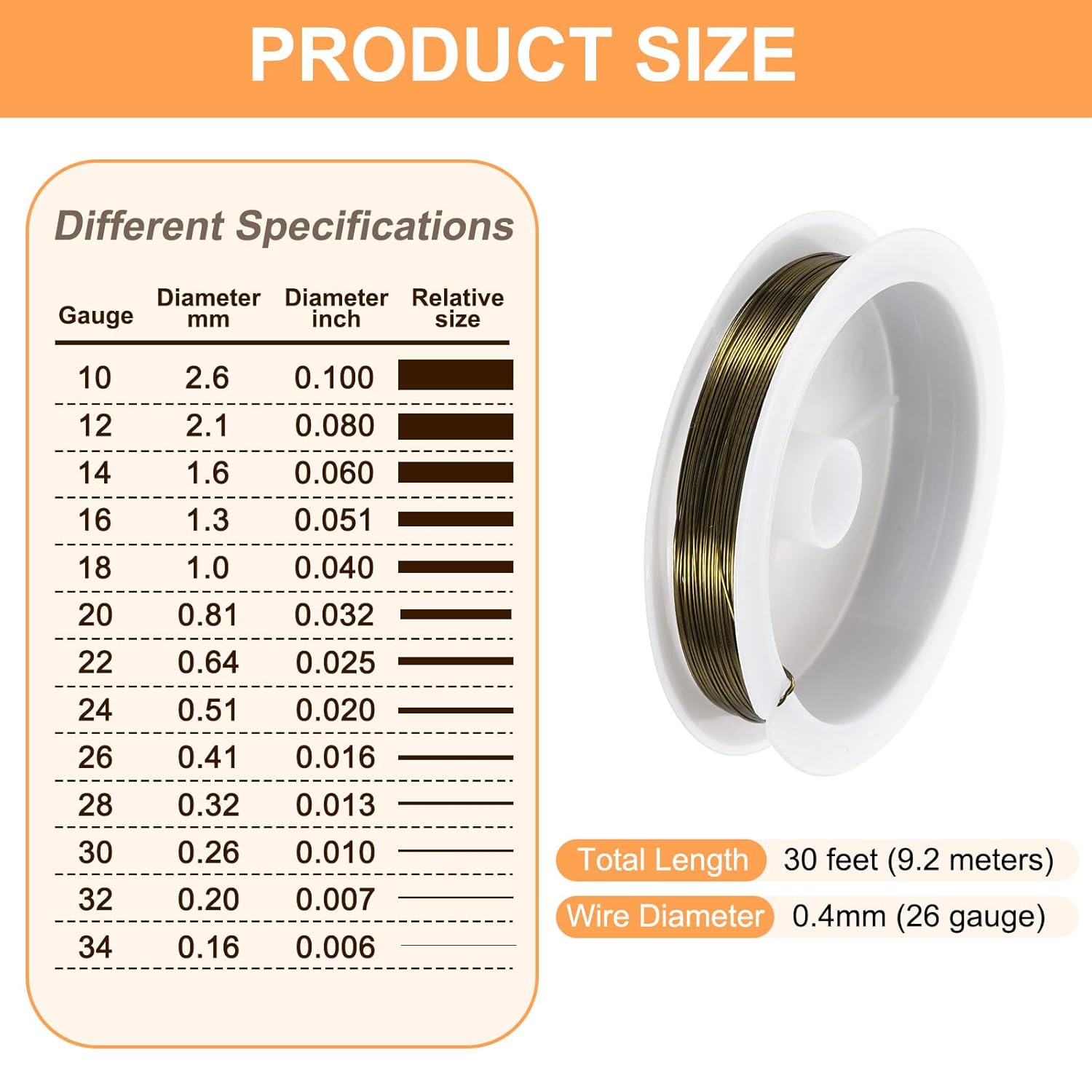 - Size - The diameter of the art wire is about 0.4mm (26 gauge) and 30 feet (9.2 meters) long. The art wire is suitable for jewelry making, beading, and jewelry repair.