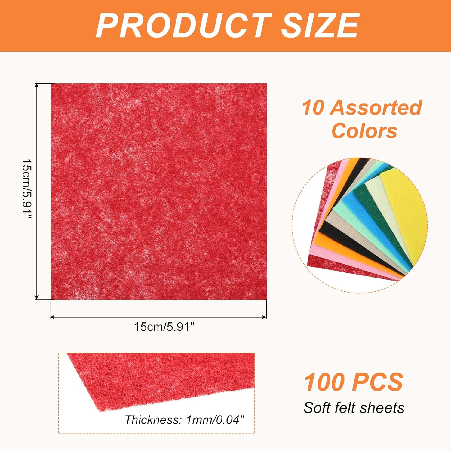 - The felt sheets, Size: 15cm x 15cm/5.91 inch x 5.91 inch(L*W); Thickness: 1mm/0.04 inch; Color: 20 Colors;the package of 100 x soft felt sheets.