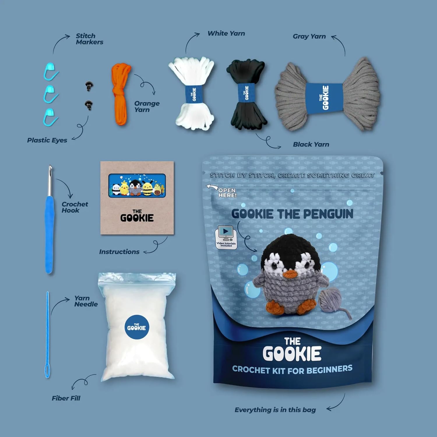 The Gookie Amigurumi Crochet Kit for Beginners β DIY Crochet Kit with Yarn, Hook, Eyes & Stuffing β Easy Starter Set with Video Tutorials β Cute Plush Toy Craft Gift for Kids, Teens & Adults (Penguin)