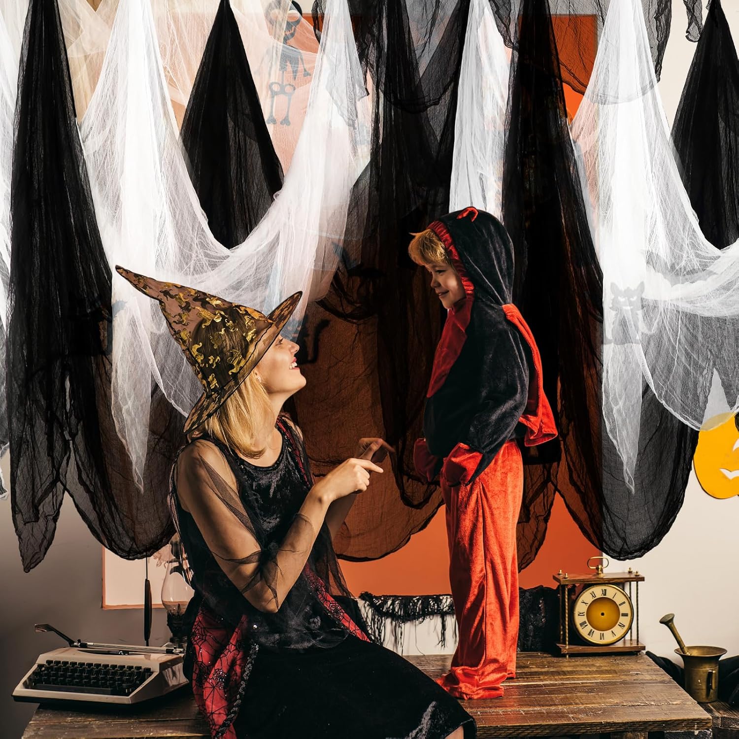 - Horror Large Halloween Cheese Cloth: this large Halloween cheese cloth measures 84.65 x 98.43 Inch, making it an ideal decoration for a fantastically spooky Halloween party; The size alone is commanding, covering a large area with a ghostly vibe, the spectral black, white color adding to the eeriness; You can entangle your guests in a web of horror and make your party the talk of the festival