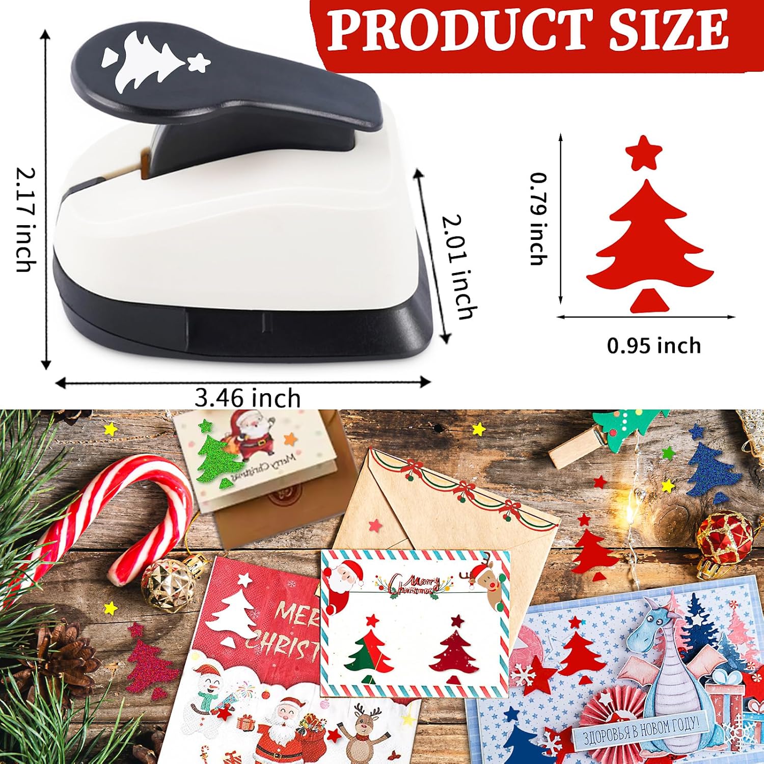 - Christmas Tree Hole Punch: The size of Christmas tree paper punches for crafting is 3.46x2.17x2.01 inch. The size of punch Christmas tree shape is 0.95 inch. The Christmas tree punch is made of ABS and zinc alloy. Create unique DIY scrapbooking for Xmas with the Christmas tree shape punch