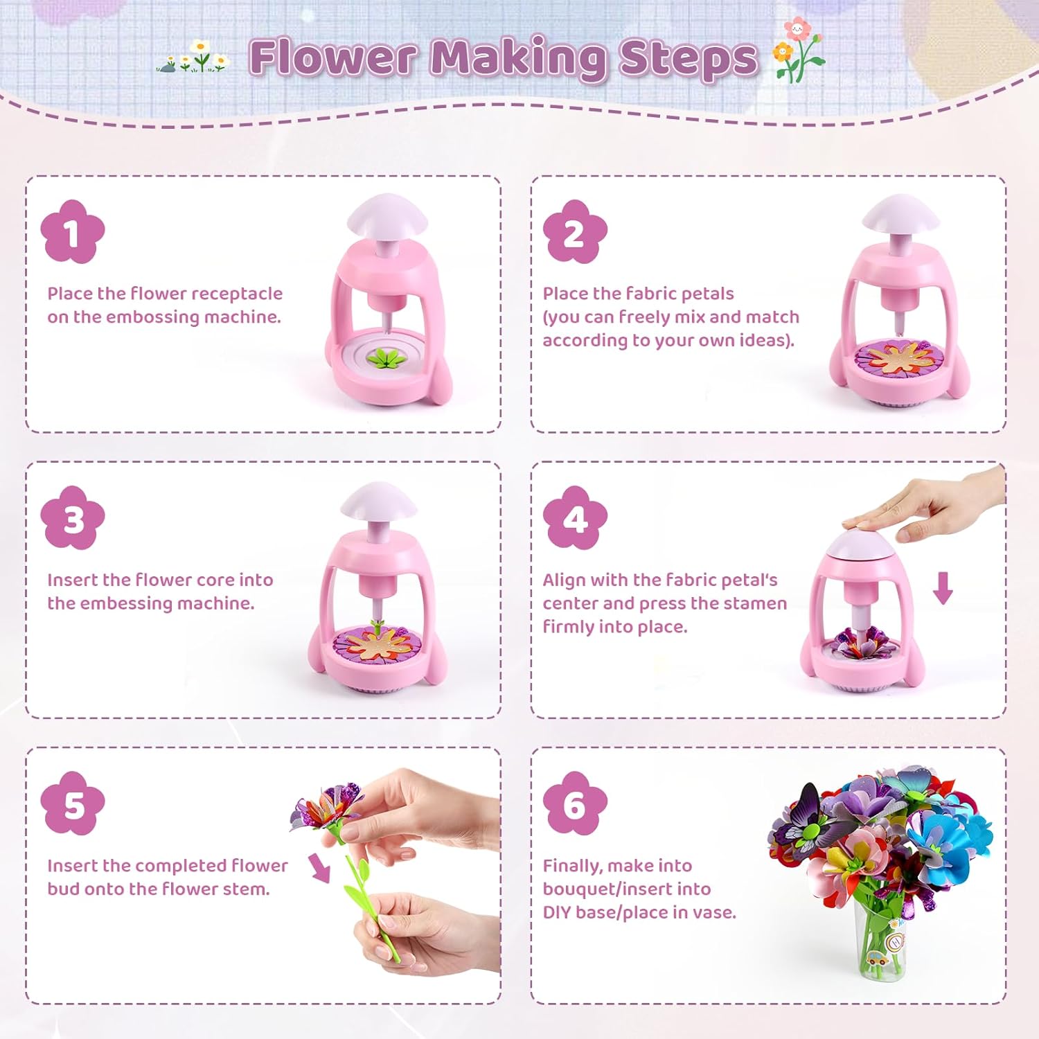 - 【Creative DIY Flower Craft Toy】Our flower press is easy to use and has a long lifespan. Made of safe and durable materials, the double-rod support design is more stable, durable, and safer, making it suitable for children aged 3-12. It ensures that children can use it steadily and safely while designing their own unique fabric flower bouquets. Let your child fully experience the joy of handmade crafts and stimulate their imagination and creativity