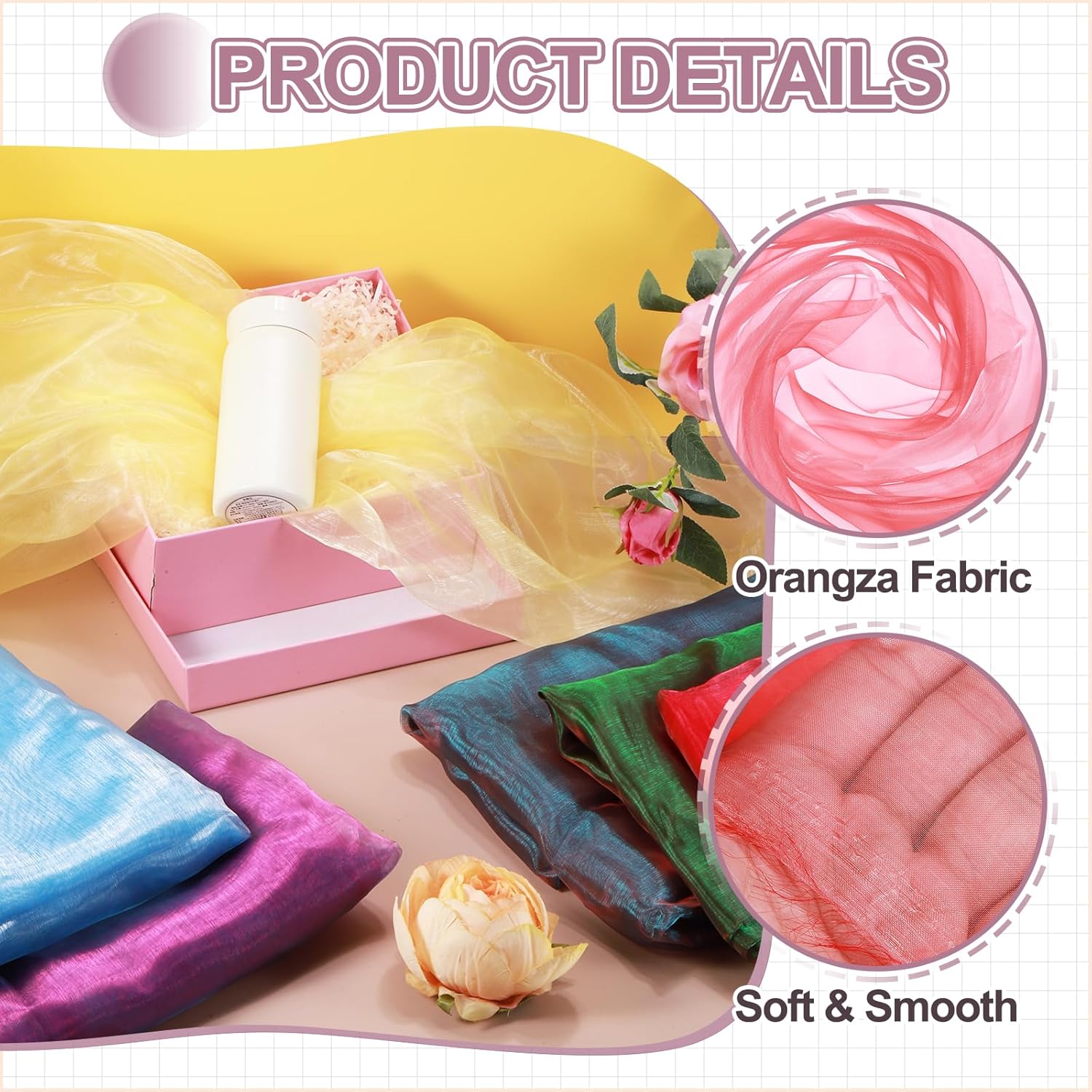 - Elevate your creative vision with this iridescent organza fabric, blending functionality and elegant beauty. Perfect for bridal wear, home decoration, curtains, table runners, event backdrops, floral arrangements, and DIY crafts.