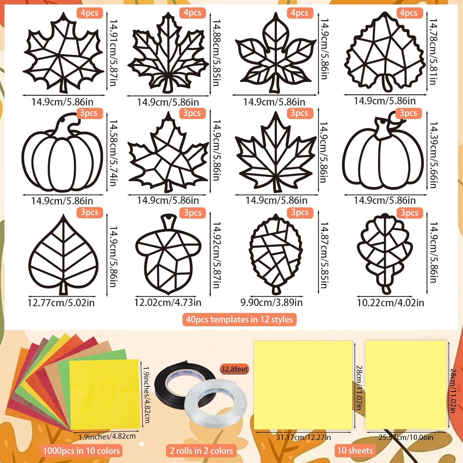 - Fall Craft Kit: 40-Piece Bulk in one set. Includes 40 pre-cut black frames (12 charming designs), 1000 tissue paper squares (1.96*1.96inches, 10 vibrant colors), 10 transparent adhesive sheets, and 2 rolls of ribbon (black, white, 32.8feet each), and instructions. Great for large groups, classrooms, or Thanksgiving events
