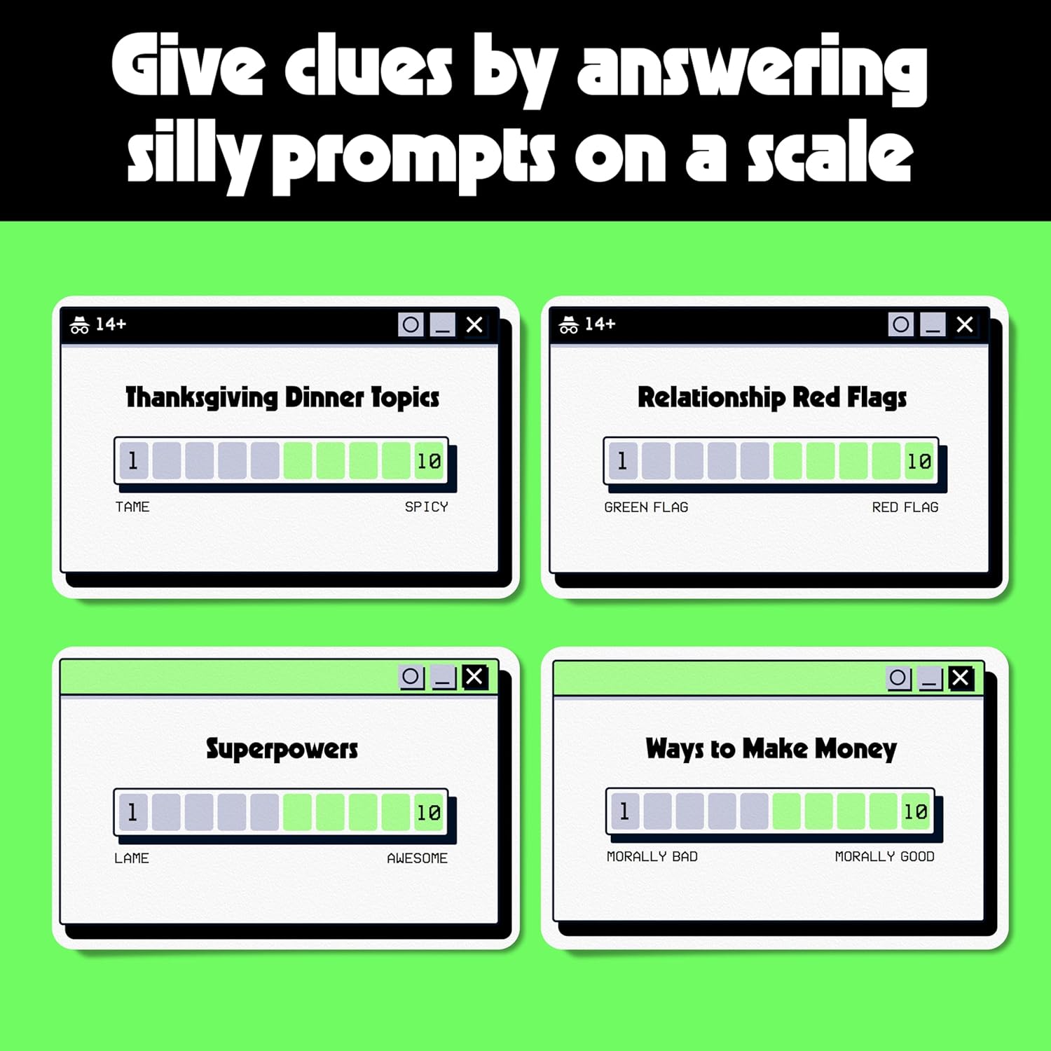 - 🗣️ GIVE CLUES BY ON A SCALE: Answer silly prompts by placing things on a scale: What is an “8” superpower on a scale of Underpowered (1) to Overpowered (10)?