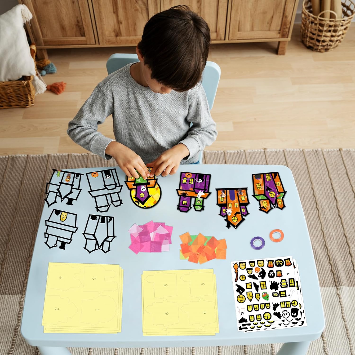 - Halloween Craft Kit: 36-Piece bulk in one set. Includes 36 pre-cut Halloween frames (6 haunted house designs), 1000 tissue paper squares (1.96*1.96inches, 10 vibrant colors), 9 transparent adhesive sheets, 6 sheets decorative stickers and 2 rolls of ribbon (orange, purple, 32.8feet each), step-by-step instructions. Great for classroom parties, Halloween events, or family crafting nights