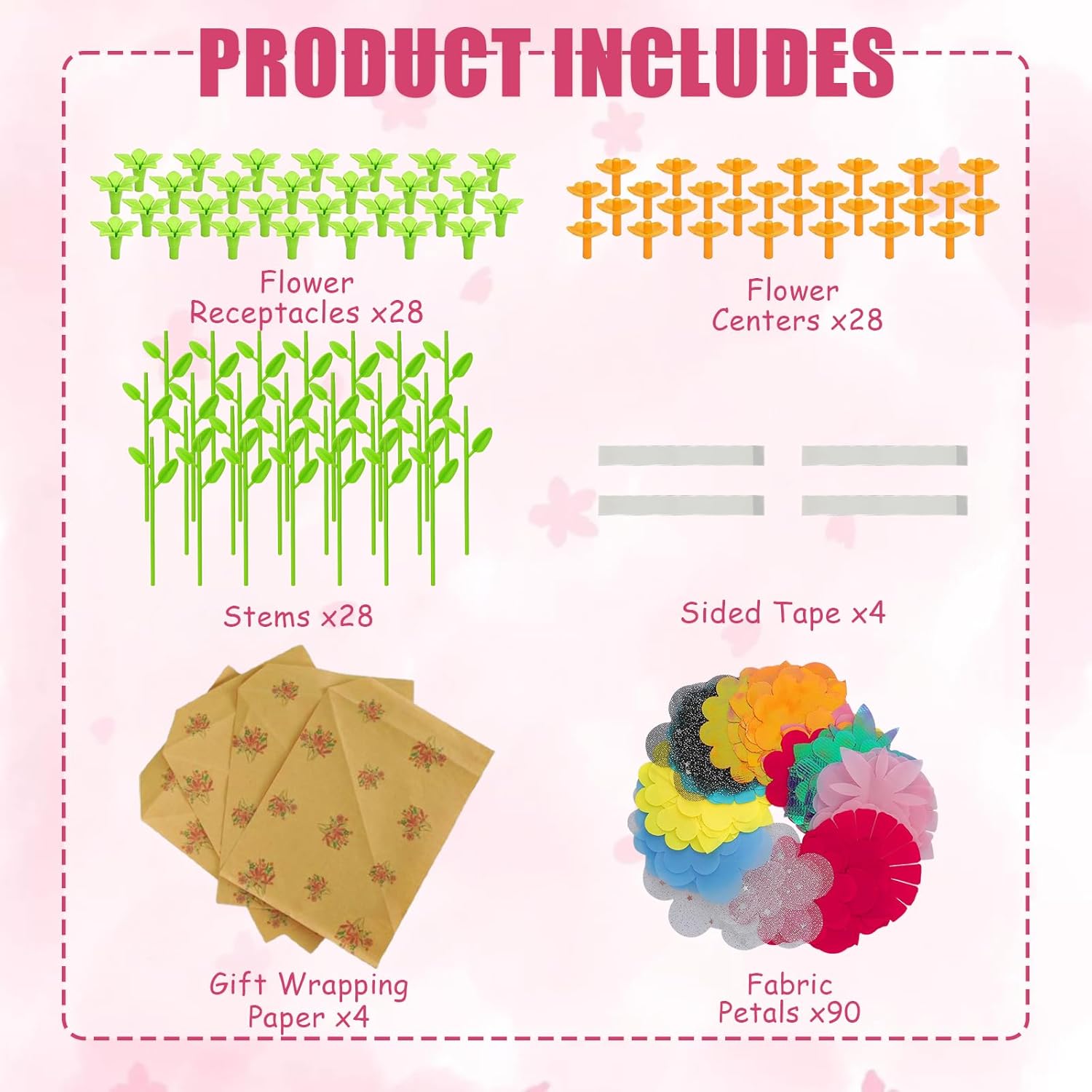 - [🌺DIY Flower Bouquet Accessory Set🌺] 90 pieces of multicolored blended fabric, 28 flower stems, 28 flowers, 28 flower centers, 4 decorative papers, and 4 double-sided tapes.