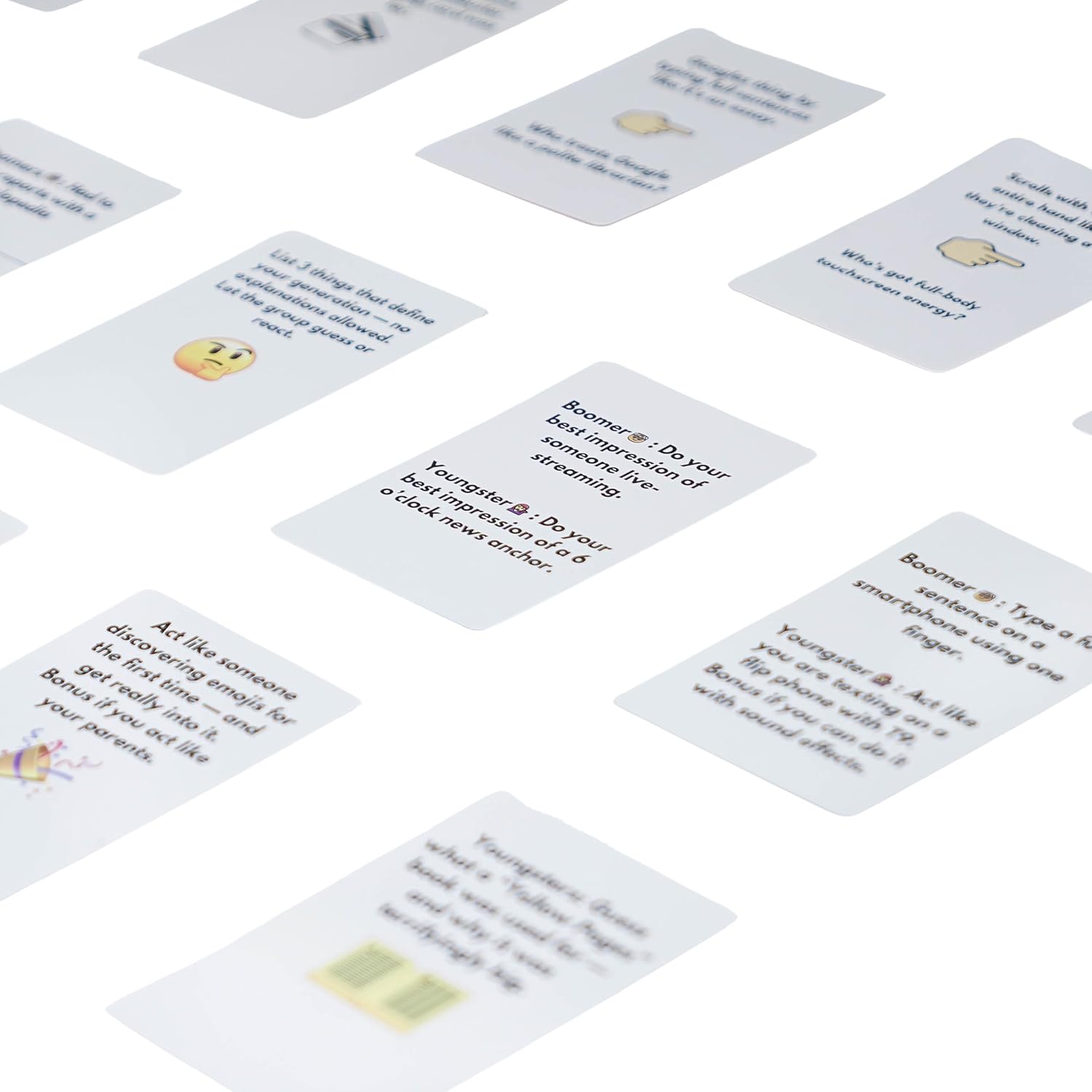 - WHAT’S INSIDE - 50 hilarious prompt cards across 5 categories: Roast, Who Had It Worse, Quickfire Dares, Generation Decoder, and Boomer vs. Youngster Face-Offs. Compact, travel-friendly, and no setup required, just shuffle and start the chaos.