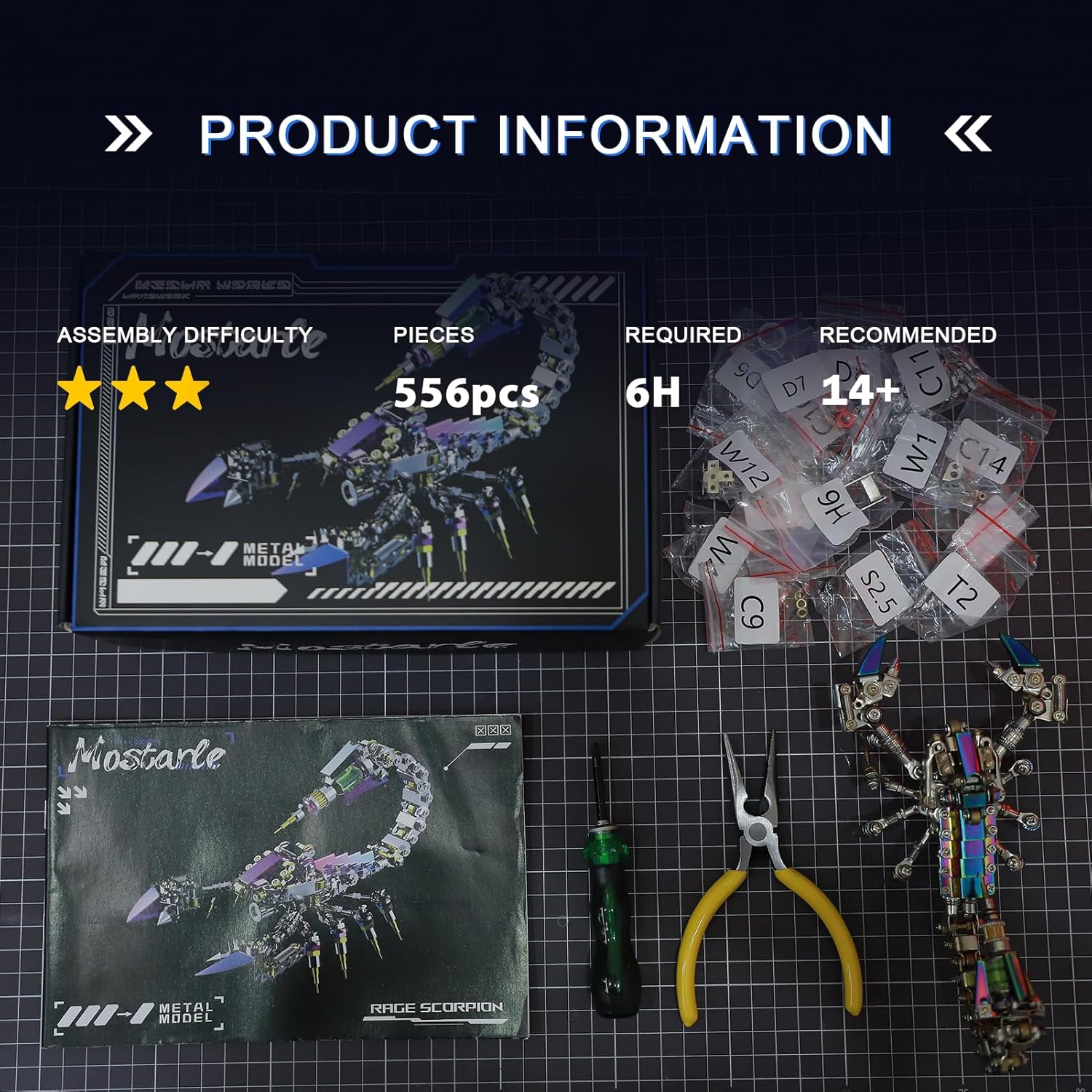 - [Craft Your Own Sci-Fi Marvel – 556 Pieces] Dive into the world of futuristic design with this advanced 3D metal puzzle. Featuring 556 finely crafted parts and a glowing LED core, the Rage Scorpion brings science fiction into your hands. A perfect challenge for puzzle lovers, creators, and makers aged 14+.